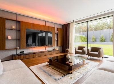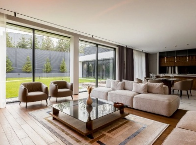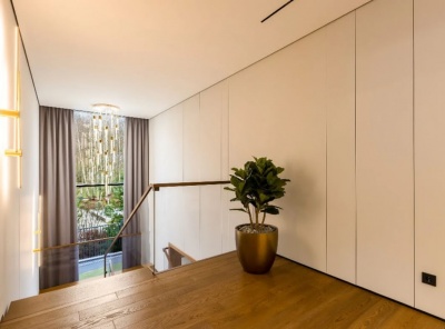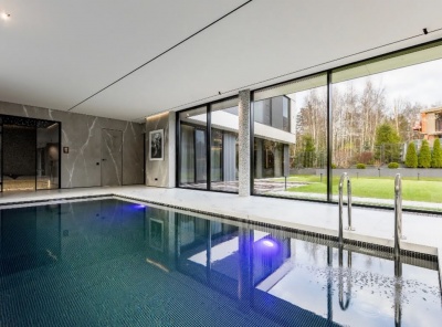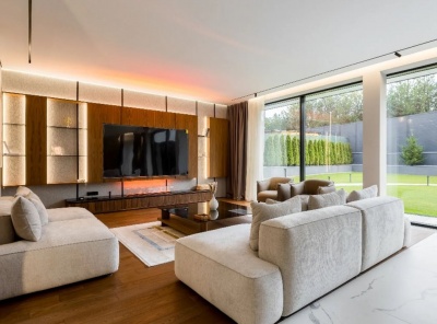 Продажа нового современного дома площадью 300 кв.м. Рублево-Успенское шоссе, 11 км. от МКАД. Коттеджный поселок Усово. Дом построен в 2 этажа, под ключ. В отделке использованы только премиальные материалы: французская доска и паркет из ясеня, натуральный мрамор в кухне, столовой зоне и санузлах, дизайнерские обои Roberto Cavalli. По всему дому — теплые полы, скрытые конвекторы под окнами и встроенная аудиосистема с Bluetooth, доступная даже в ванных комнатах. Высокие потолки (3,1 м) и панорамные окна наполняют пространство светом.