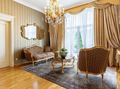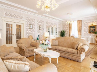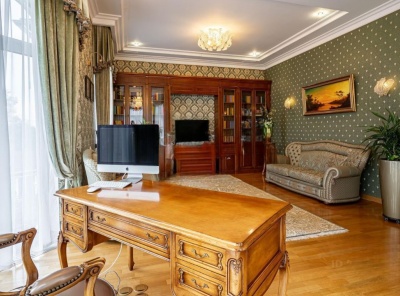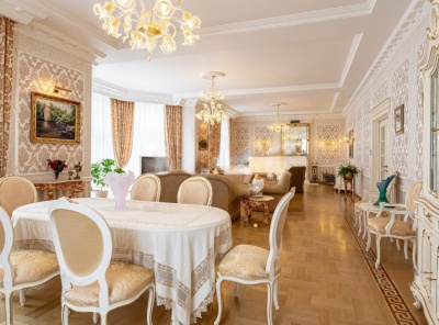 Продажа загородного дома площадью 580 кв. м. Новорижское шоссе 29 км. от МКАД. Коттеджный поселок Русская Деревня. Дом построен в 2 этажа, под ключ в классическом стиле. Фасад со шпилями придаёт внешнему облику дома сказочный вид. На большом балконе будет приятно отдыхать, любуясь вдохновляющим видом на лес. Шикарный интерьер дополнен изысканной мебелью и предметами декора. Большая площадь остекления и высокие потолки визуально увеличивают внутреннее пространство.
