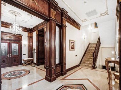 Продажа загородного дома площадью 500 кв.м. Коттеджный поселок Русская деревня. Новорижское шоссе, 24 км от МКАД. Дом построен в 2 этажа, под ключ. В интерьере дома использованы исключительно натуральные и светлые отделочные материалы, создающие атмосферу элегантности и уюта. Камин и лестница выполнены из благородного светлого мрамора, колонны облицованы травертином, а мебель дополнена изысканными вставками из оникса.