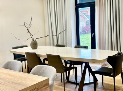 Аренда загородного дома площадью 620 кв.м. Новорижское шоссе, 27 км от МКАД. Коттеджный поселок Крона. Дом построен из кирпича, в 3 этажа. Под ключ. Полностью меблирован и оборудован всей необходимой техникой. Просторный участок 19 соток.Планировка:1 этаж - зона прихожей, гардеробная комната, кухня-гостиная с панорамными окнами, биокамином и выходом на летнюю террасу,2 этаж - спальня с панорамным эркерным окном и биокамином, двумя раздельными гардеробными и большой мастер-ванной.
