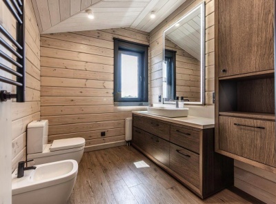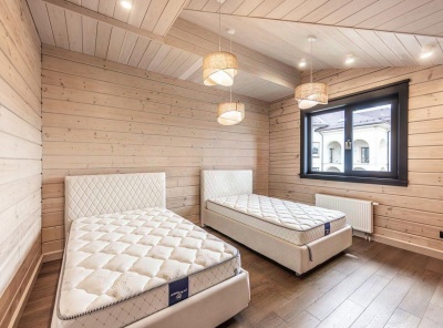 Продажа загородного дома общей площадью 450 кв.м. Новорижское шоссе, 17 км от МКАД. Коттеджный поселок Шато Соверен. Дом построен в 2 этажа из бруса. Участок 30 соток. На участке расположен отдельно стоящий гараж на 4 м/м, а также квартира для персонала с бойлероной (200 кв.м.). Все коммуникации центральные и проходят по границе. Установлен эллектрический котел.Планировка:1 этаж - холл, гардеробная, кухня-гостиная-столовая, с/у, баня, душевая с купелью, раздевалка, комната отдыха, с/у, 2 кладовые, постирочная2 этаж - 3 спальни, с/у, гардеробная.