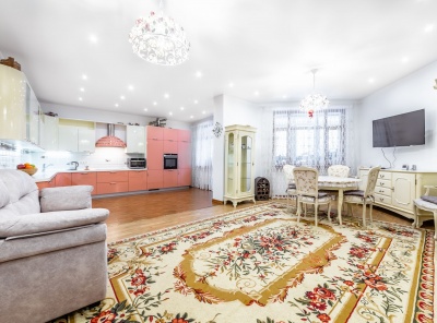 Аренда 3-комнатной квартиры площадью 110 кв.м. c ремонтом в современном стиле. Метро Университет, 1 минута пешком. Ломоносовский проспект, дом 25к5. ЖК Доминион. Кухня оборудована современной бытовой техникой Kupperbush. Квартира выполнена в тёплых светлых тонах. Квартира меблирована итальянской дорогой мебелью. Есть одно машиноместо в подземном паркинге рядом с лифтом. Планировка: кухня-гостиная, 2 спальни, постирочная, 2 санузла.