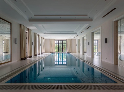 Продажа загородного особняка площадью 3100 кв.м. Новорижское шоссе, 23 км от МКАД. Коттеджный поселок Агаларов Эстейт. Особняк построен в 4 уровня, в стиле английской классики из кирпича на берегу водоема с прекрасным видом на живописный поселок и лесную зону. Под чистовую отделку. Ровный участок 58 соток со спуском к воде. Планировка:1 этаж - прихожая, гардеробная, гостиная с камином, кухня, столовая, зона барбекю с выходом на террасу, 2 спальни с гардеробными, 4 с/у, бассейн 15 на 5кв.