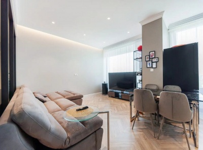 Аренда 2-комнатной квартиры площадью 65 кв.м. Метро Арбатская, 6 минут пешком. Никитский бульвар, дом 12. Квартира полностью меблирована, вся мебель от импортных производителей. Ремонт выполнен в современном стиле, в светлых тонах. Имеется вся необходимая бытовая техника, а также система кондиционирования. Окна выходят на улицу. Паркинг во дворе, на закрытой территории дома, въезд под шлагбаум.Планировка: кухня-гостиная, спальня + собственный с/у, гостевой с/у.