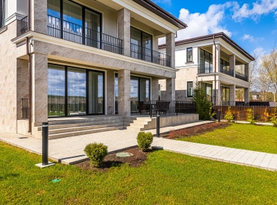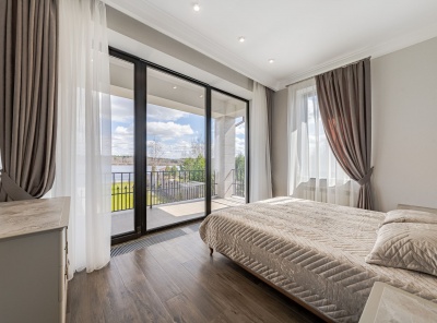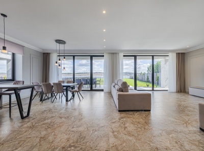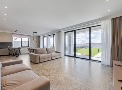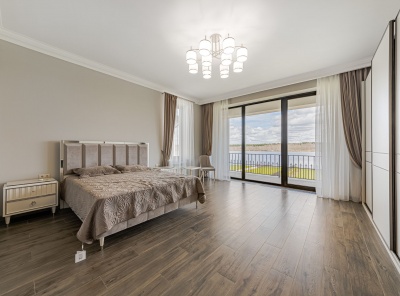 Продажа загородного дома площадью 370 кв.м. коттеджный поселок Чистые пруды. Новорижское шоссе, 14 км от МКАД. В доме выполнено панорамное остекление и открывается незабываемый вид на большую воду озер. У дома есть прямой выход к озеру и собственный пирс. Дом построен в современном стиле из высококачественных материалов. Стильный интерьер исполнен в спокойных тонах. В доме большая площадь остекления и высокие потолки, что наполняет внутреннее пространство воздухом. Из-за панорамного освещения в доме много солнечного света в течение дня.