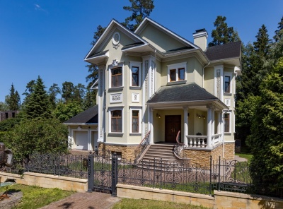 Продажа загородного дома площадью 600 кв.м. Коттеджный поселок Новахово. Новорижское шоссе, 12 км от МКАД. Дом построен в 2 этажа в классическом стиле. Под ключ. Дом окружён ухоженным садом. На участке площадью 16 соток располагается детская площадка, спортивная площадка. Гараж на 2 м/м с квартирой персонала. Планировка:1 этаж - холл, каминный зал, столовая, кухня, с/у, гостевая спальня с с/у, 2 этаж - 4 спальни с индивидуальными с/у и гардеробными.