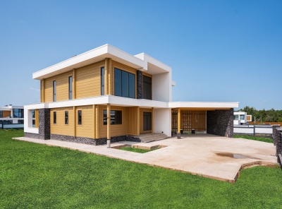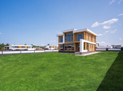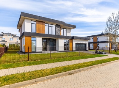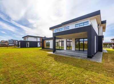 Продажа загородного дома площадью 346 кв.м. Киевское шоссе, 25 км от МКАД. Коттеджный поселок Райт Вилладж. Панорамные окна, плоская кровля, продуманная функциональная планировка. Солнечный просторный участок 17 соток. Все коммуникации центральные.Планировка:1 этаж: прихожая с гардеробной комнатой, кухня-столовая и гостиная, гостевой с/у, гостевая спальня, ванная или постирочная, котельная. 2 этаж: мастер-спальня с собственной ванной комнатой, две детские с собственным с/у, спальня или кабинет с гардеробной и с/у, холл, гардеробная.