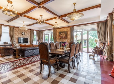 Уникальное предложение! Продажа загородной резиденции с бассейном площадью 1300 кв.м. Новорижское шоссе, 9 км от МКАД. Коттеджный поселок Никольская Слобода. Коттедж построен по индивидуальному проекту в 2 этажа. Выполнена качественная отделка в современном стиле. Полностью меблирован. Лесной участок 55 соток с баней и ландшафтом. Планировка:1 этаж — прихожая с гардеробной, кухня-столовая с выходом на террасу, двусветная гостиная с камином, комната отдыха, бильярдная, бассейн 12 х 4 м, 2 с/у.