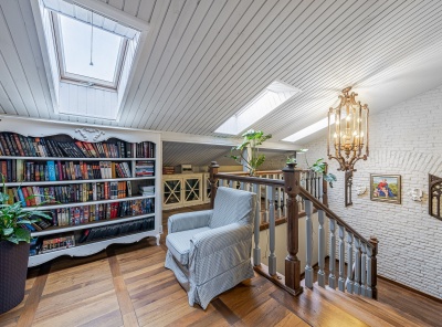 Продажа загородного дома общей площадью 500 кв.м. Новорижское шоссе, 19 км от МКАД. Коттеджный поселок Миллениум Парк. Дом построен в 2 этажа по индивидуальному проекту по технологии фахверк с заполнением клееным брусом, с отделкой. Большая площадь остекления, потолки в гостиной до 5.5 м. Участок 12 соток расположен у канала и парка.