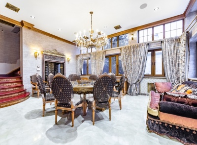 Аренда загородного дома общей площадью 550 кв.м. Коттеджный поселок Риверсайд. Новорижское шоссе, 23 км от МКАД. Коттедж построен в классическом английском стиле в 2 этажа, под ключ. Панорамные окна, много света, высокие потолки. Укомплектован всей необходимой мебелью и техникой для аренды. Участок 30 соток. Уличный бассейн с подогревом и противотоком, работает с апреля по ноябрь. Гараж на 2 м/м. Планировка:1 этаж - холл, кухня-столовая-гостиная с камином, гостиная, гостевая спальня, с/у,2 этаж - 4 спальни со своими с/у и гардеробными, кабинет.