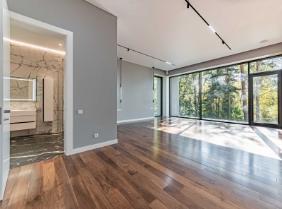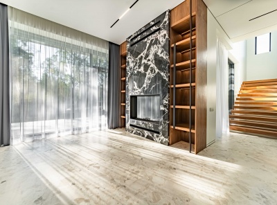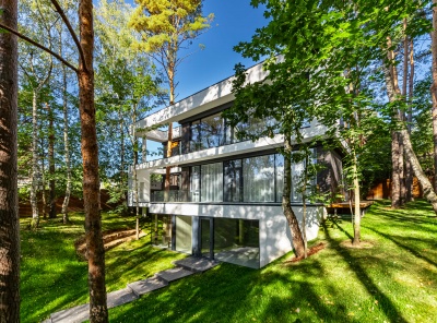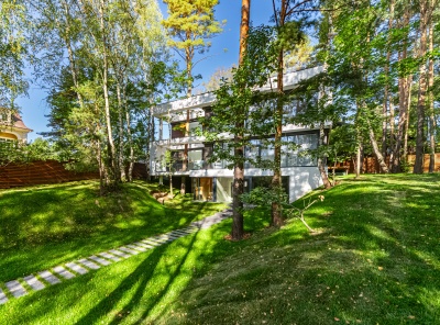 Продажа загородного дома площадью 600 кв. м. Новорижское шоссе, 20 км. от МКАД. Коттеджный поселок Веледниково. Дом построен в 2 этажа. Современный коттедж среди вековых сосен гармонично соединяет инновационную архитектуру и естественную красоту природы. Фасад выдержан в минималистичном стиле с элементами хай-тека: тёмный натуральный камень, тёплые деревянные панели и белые геометрические акценты формируют строгий и в то же время изысканный облик здания.