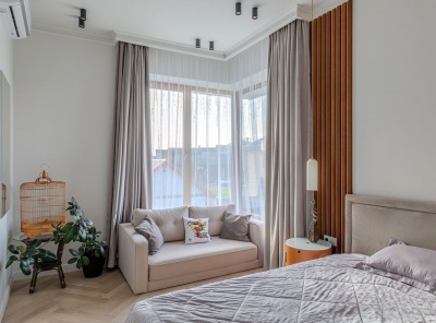 Продажа загородного дома площадью 568 кв.м. Коттеджный поселок Петровский парк. Новорижское шоссе, 35 км от МКАД. Дом построен в 2 этажа, под ключ. Этот дом поражает гармонией архитектурных форм и продуманностью каждой детали. Фасад сочетает в себе тёплые оттенки штукатурки с декоративной кирпичной кладкой, создавая уютное и одновременно представительное впечатление. Белые наличники и ставни придают зданию европейский шарм, а аккуратный фронтон с симметричными окнами подчёркивает архитектурное совершенство.
