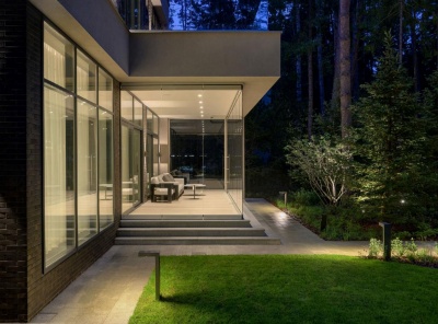 Продажа загородного дома площадью 645 кв.м. Рублево-Успенское шоссе, 25 км. от МКАД. Коттеджный поселок Маслово. Авторский проект архитектурной студии VForm. Состоит из основного дома (374 кв.м), банного комплекса (172 кв.м) и гаража на 3 м/м с блоком персонала (99 кв.м). Особенности домовладения: совершенно новый дом, стильный авторский интерьер, дорогие отделочные материалы (много натурального камня), панорамное остекление, система умный дом, приточно-вытяжная вентиляция и разнообразные датчики.