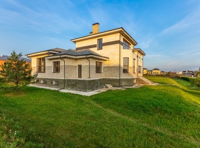 Продажа нового загородного дома площадью 490 кв.м. Новорижское шоссе, 23 км от МКАД. Коттеджный поселок Новорижский. Дом построен в 2 этажа из кирпича в современном стиле. Фундамент - монолитный железобетон (сваи + ростверк); стены и перекрытия - кирпич, газобетон, монолитный железобетон; кровля - черепица DOCKE; фасад - природный камень (песчаник), элитный клинкер (Германия), планкен (кумару). Архитектурная подсветка фасада. Высокое качество строительства. Участок 12 соток расположен в самой тихой и приватной части поселка. Рядом хвойная аллея.